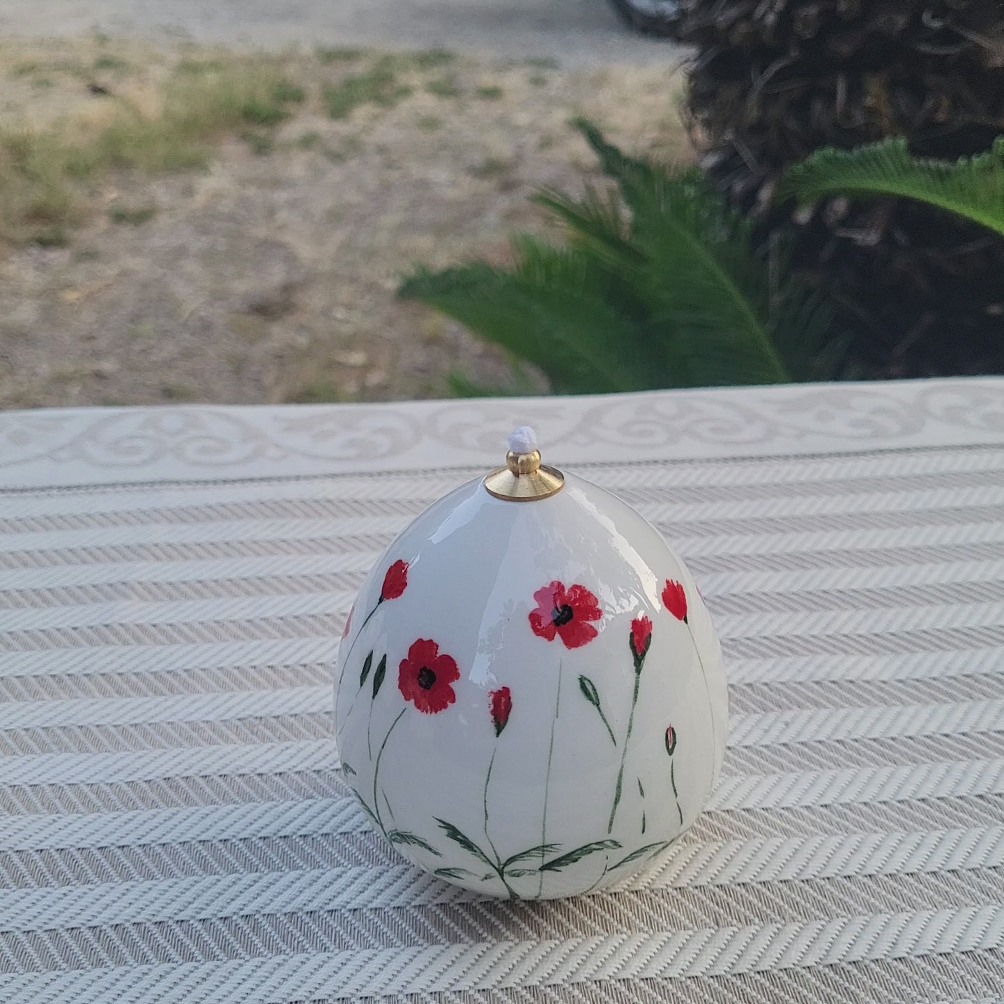 Questa raffinata lampada ad olio è realizzata in ceramica artistica a forma di uovo, interamente lavorata a mano. La superficie, levigata e lucidata, è decorata con la tecnica dell’engobbio, che consente di applicare colori naturali su argilla ancora cruda, conferendo un effetto delicato ai disegni.