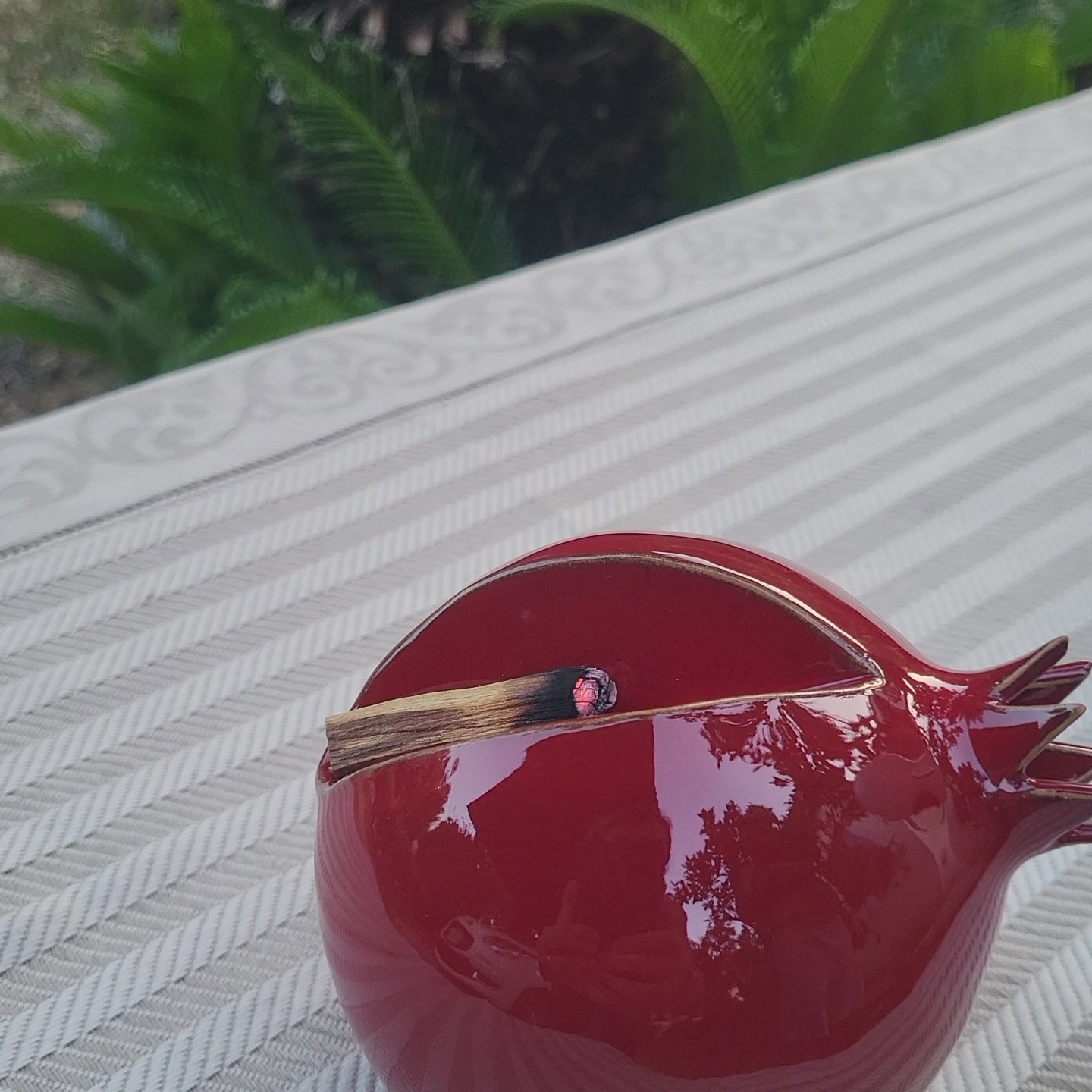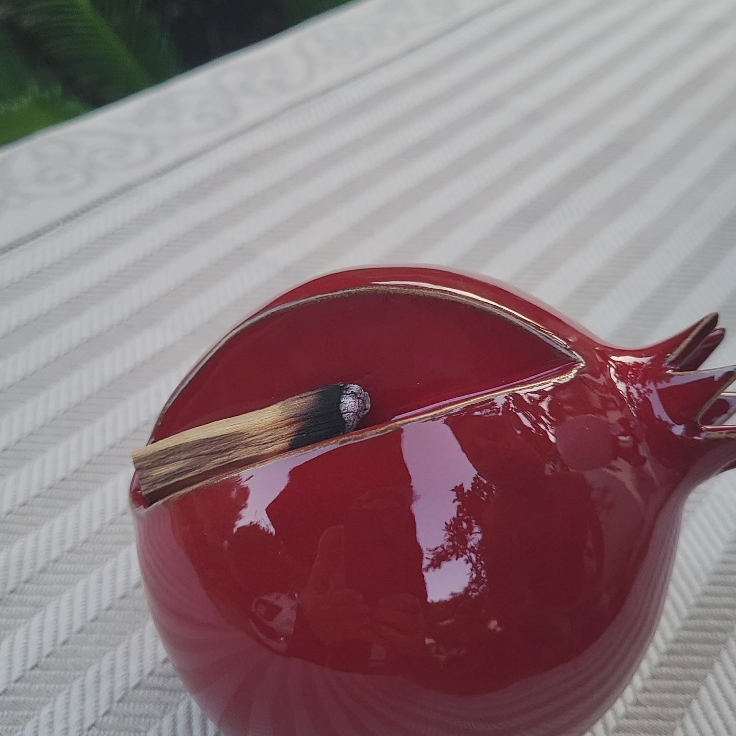 Un incavo nel corpo della melagrana è pensato per accogliere con eleganza un bastoncino di palosanto, trasformando la ceramica in un raffinato brucia-incenso. L’incavo è perfettamente integrato nel design, mantenendo l’armonia della forma e aggiungendo una funzione contemplativa: mentre il palosanto brucia, il fumo si diffonde delicatamente attorno alla melagrana, evocando un'atmosfera di calma e spiritualità.