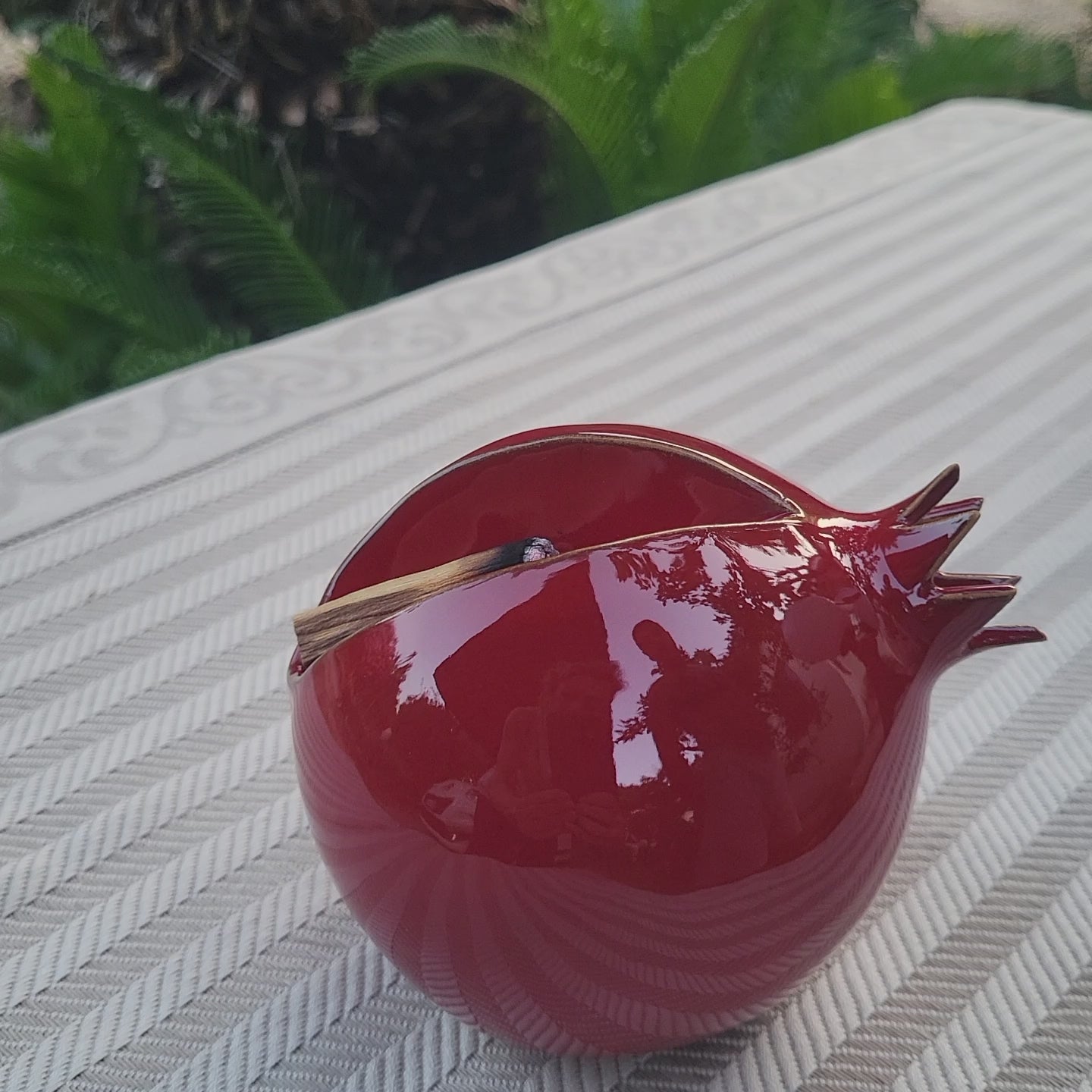 Questa ceramica artistica, modellata al tornio a forma di melagrana, unisce simbolismo e funzionalità in un unico oggetto decorativo. Realizzata interamente a mano, la superficie è rivestita da una smaltatura rosso intenso, lucida e vibrante, che richiama il colore vivo dei chicchi del frutto. Le delicate sfumature e le imperfezioni volute conferiscono unicità e calore all'opera, rendendola un perfetto connubio tra artigianato e arte.